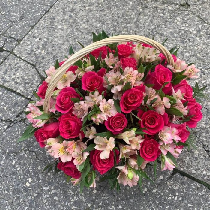 Корзина из альстромерий,розовых роз и зелени Синтия