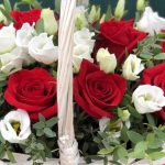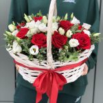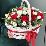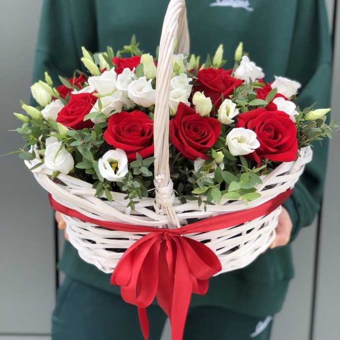 Эустома – 4 шт. Эвкалипт – 3 шт. красная роза фридом – 11 шт. Корзина – 1 шт. Оазис – 2 шт. Оформление – 1 шт.