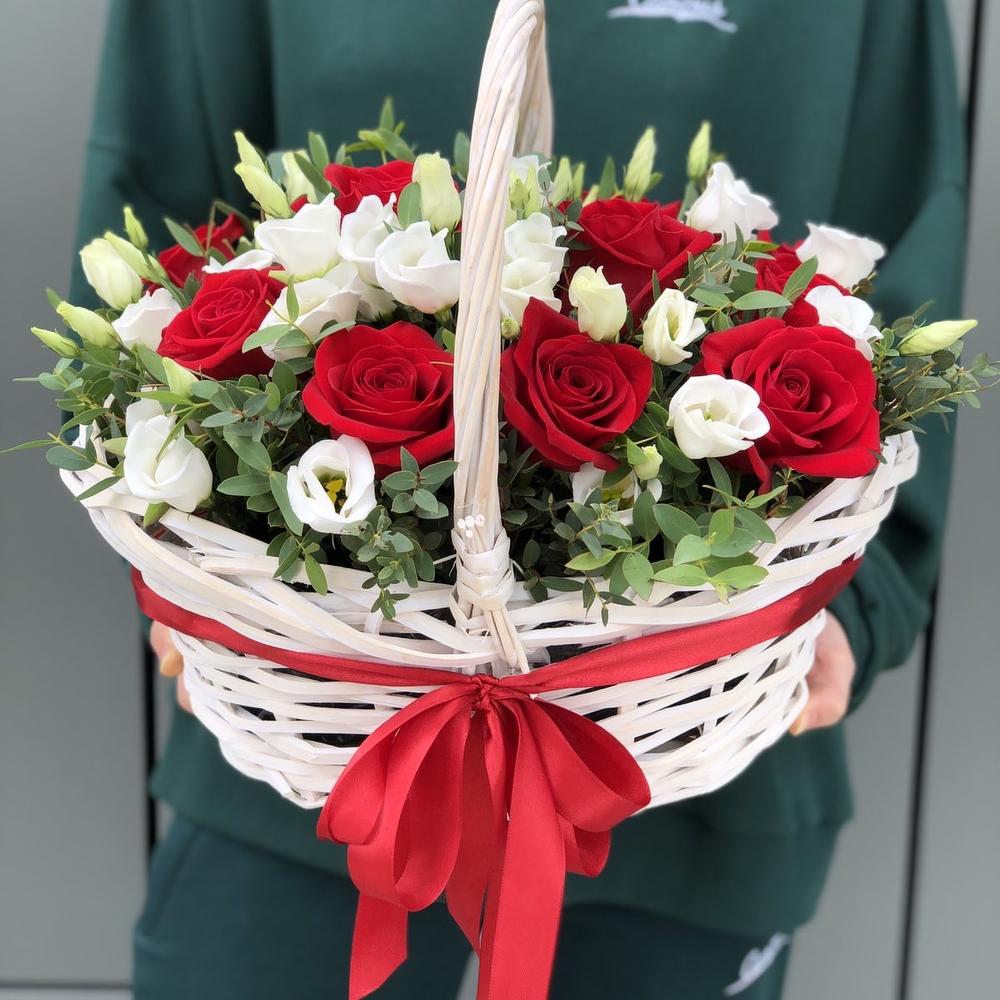 Корзина из красных роз и эустомы Вселенная