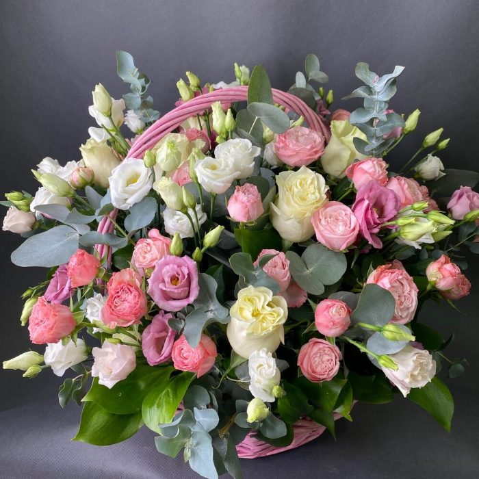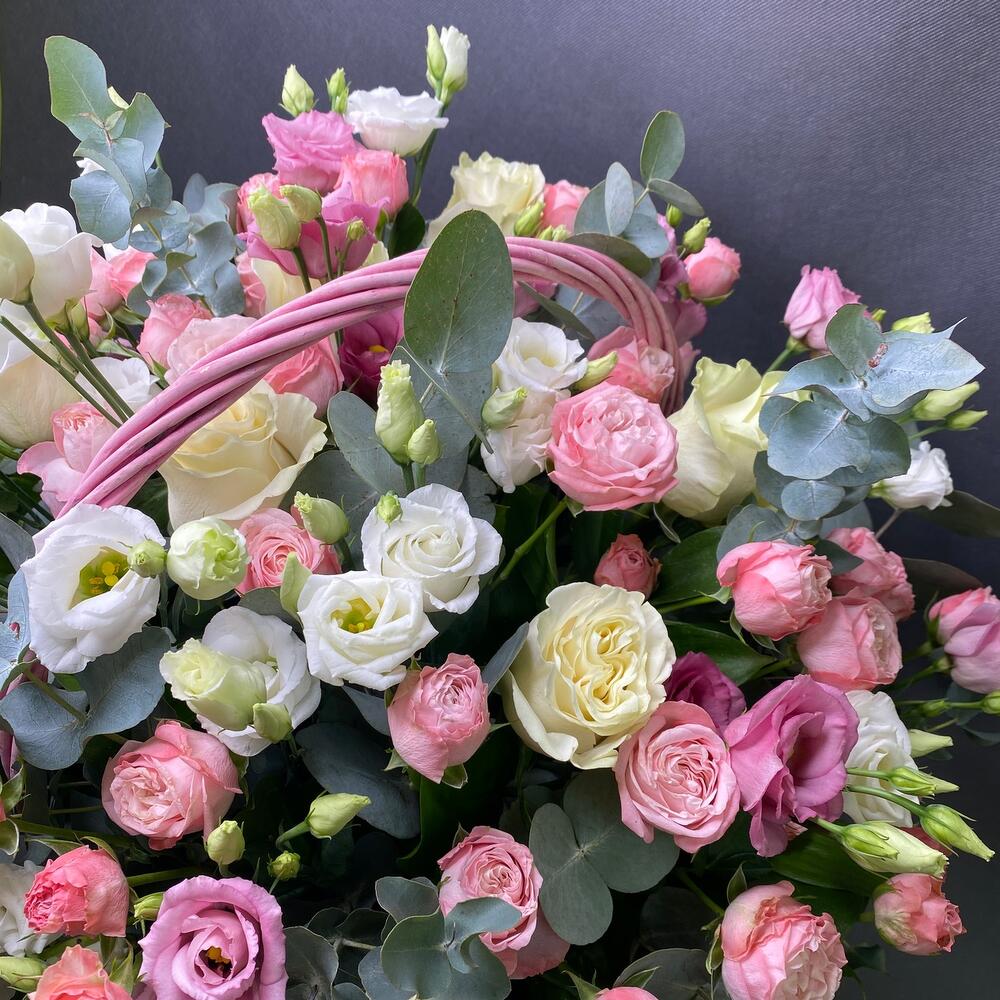 Роза Эквадор – 7 шт.Роза кустовая пионовидная – 7 шт.Лизиантус – 7 шт.Рускус – 10 шт.эвкалипт ветка – 2 шт.Оазис флористический – 2 шт.Корзина большая – 1 шт.