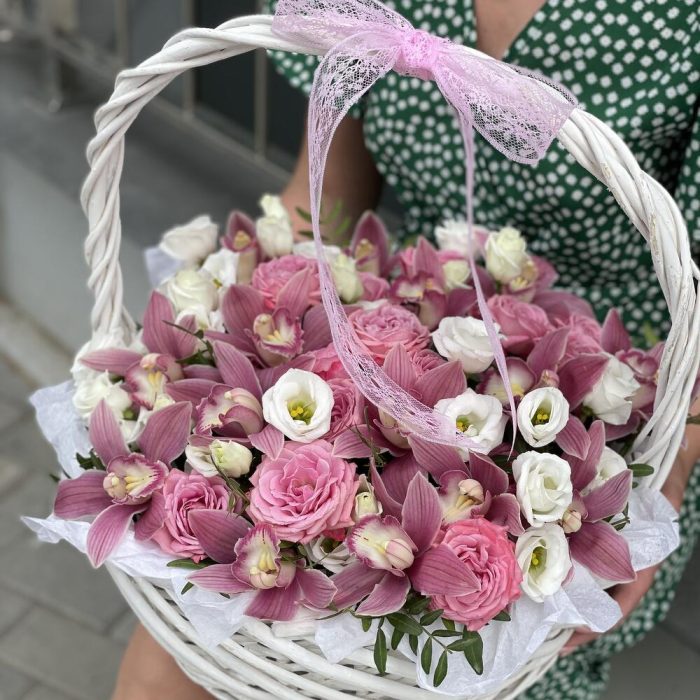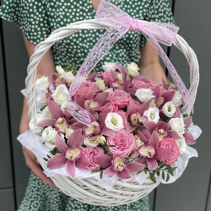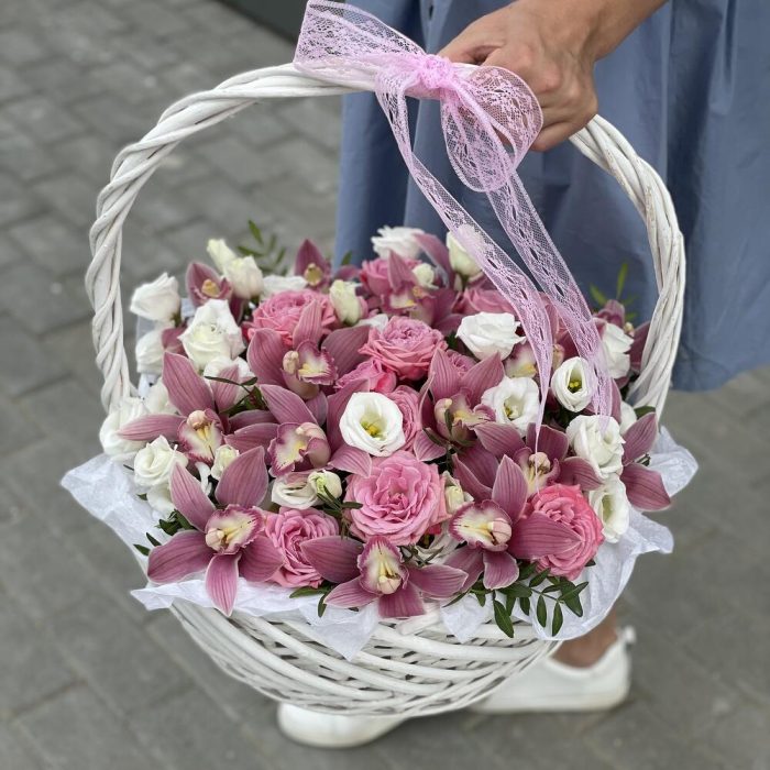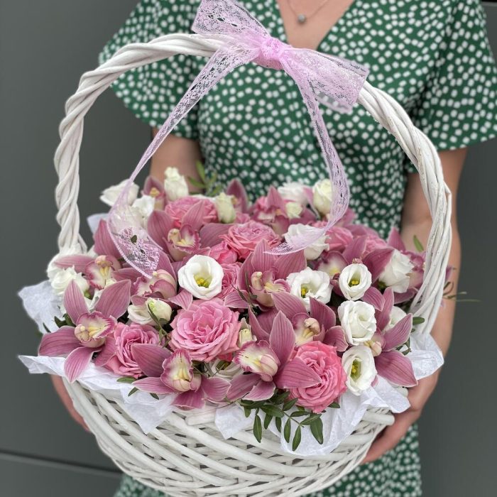 Корзина Розовое наслаждение из цимбидиума, роз и эустомы