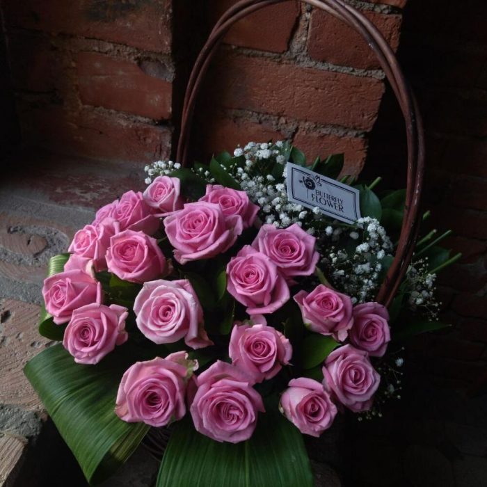Корзина с 19 розовыми розами и гипсофилой “Самой яркой”