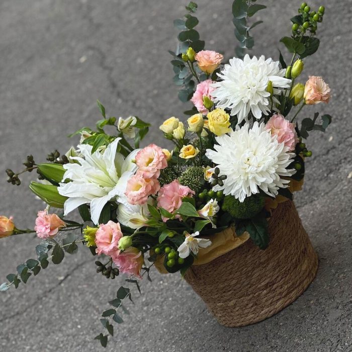 Лизиантус – 5 шт. Лилия – 1 шт. Хризантема – 3 шт. Гиперикум – 2 шт. Эвкалипт – 3 шт. Кустовая роза – 3 шт. джутовая корзина – 1 шт.
