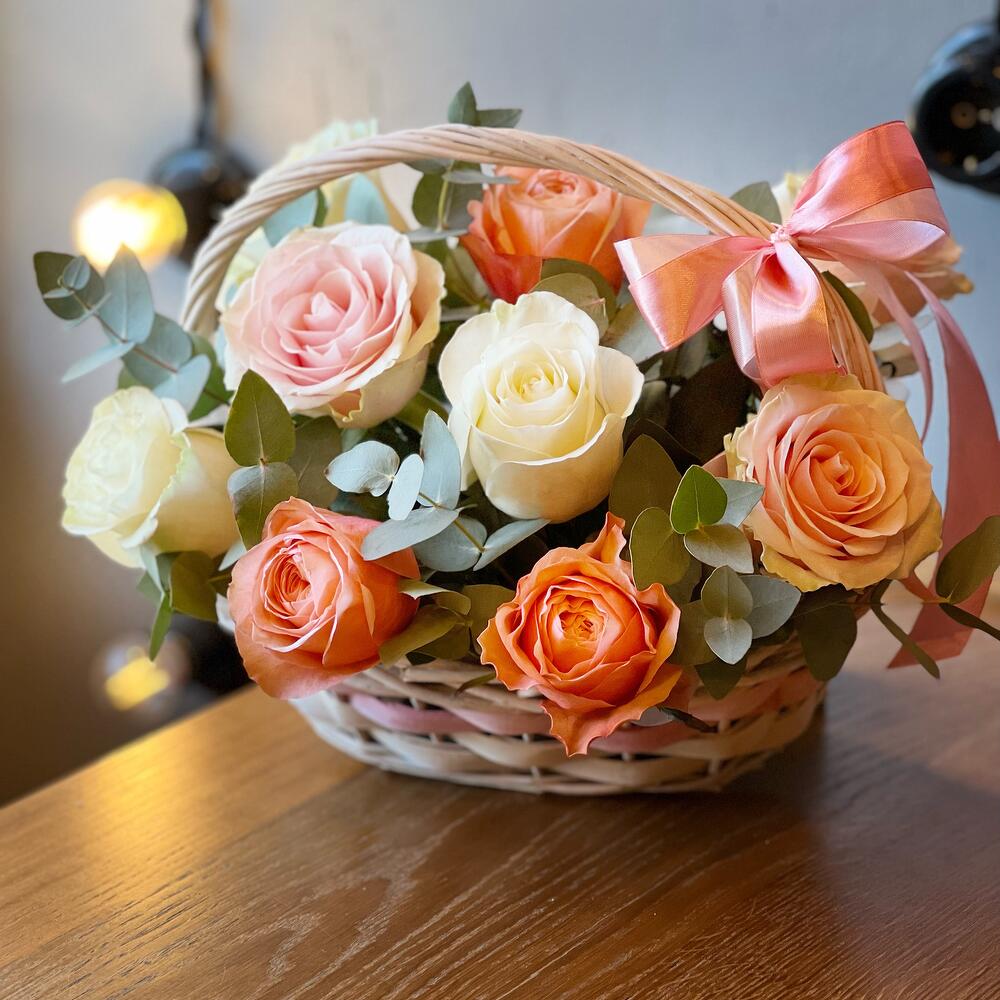 Эвкалипт – 7 шт.Лента атласная – 1 шт.Корзина плетеная – 1 шт.Оазис флористический – 1 шт.розы микс – 9 шт.работа флориста – 1 шт.