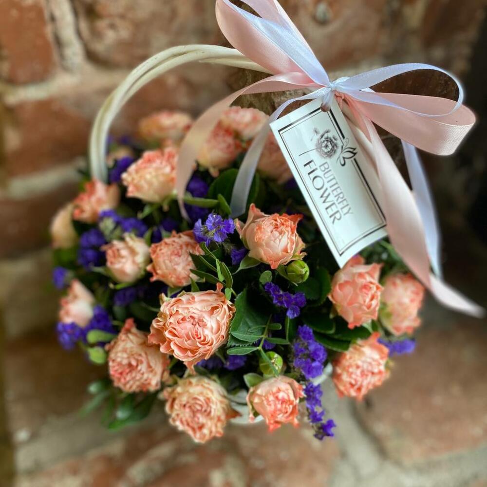 Корзина с кустовыми розами и статицей "Васильковый рассвет"