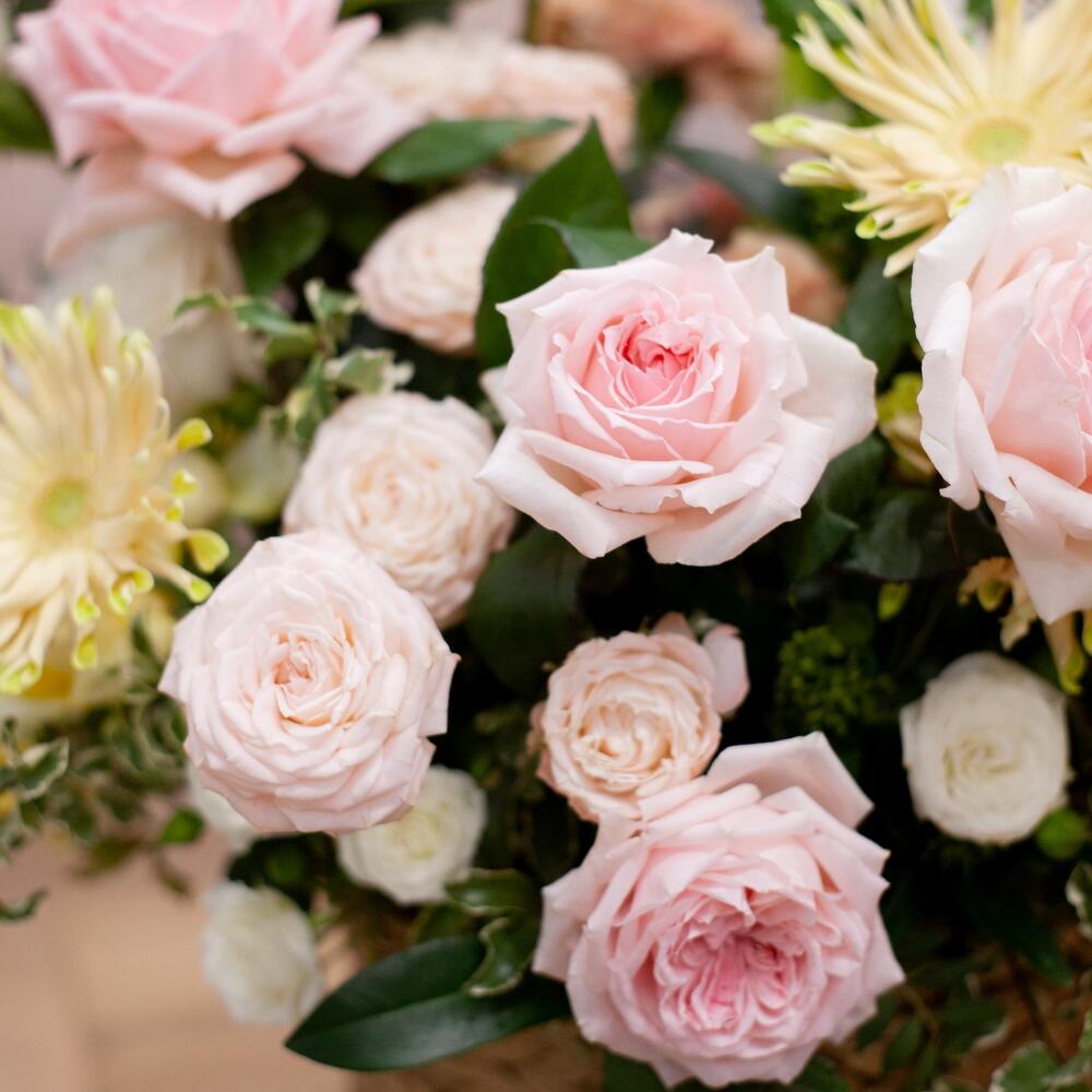Гербера – 10 шт.Роза пионовидная кустовая – 3 шт.Роза кустовая – 6 шт.роза хитоми – 6 шт.Роза пионовидная – 5 шт.Диантус – 8 шт.Скиммия – 5 шт.Питтоспорум – 5 шт.Эвкалипт – 7 шт.Молюцелла – 3 шт.