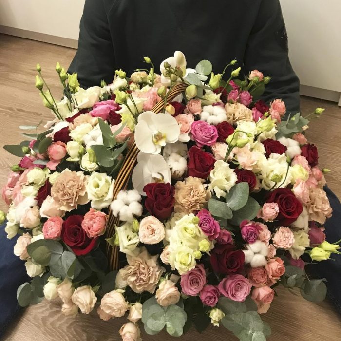 роза премиум эквадор – 25 шт.Диантус – 20 шт.Эвкалипт – 15 шт.Хлопок натуральный – 12 шт.роза кустовая “мисс бомбастик” – 10 шт.роза кустовая “бомбастик” – 10 шт.роза кустовая “мадам бомбастик” – 10 шт.роза кустовая “леди бомбастик” – 10 шт.эустома “алиса вайт” – 10 шт.орхидея “фаленопсис” – 2 шт.Оазис флористический – 4 шт.Корзина плетеная – 1 шт.