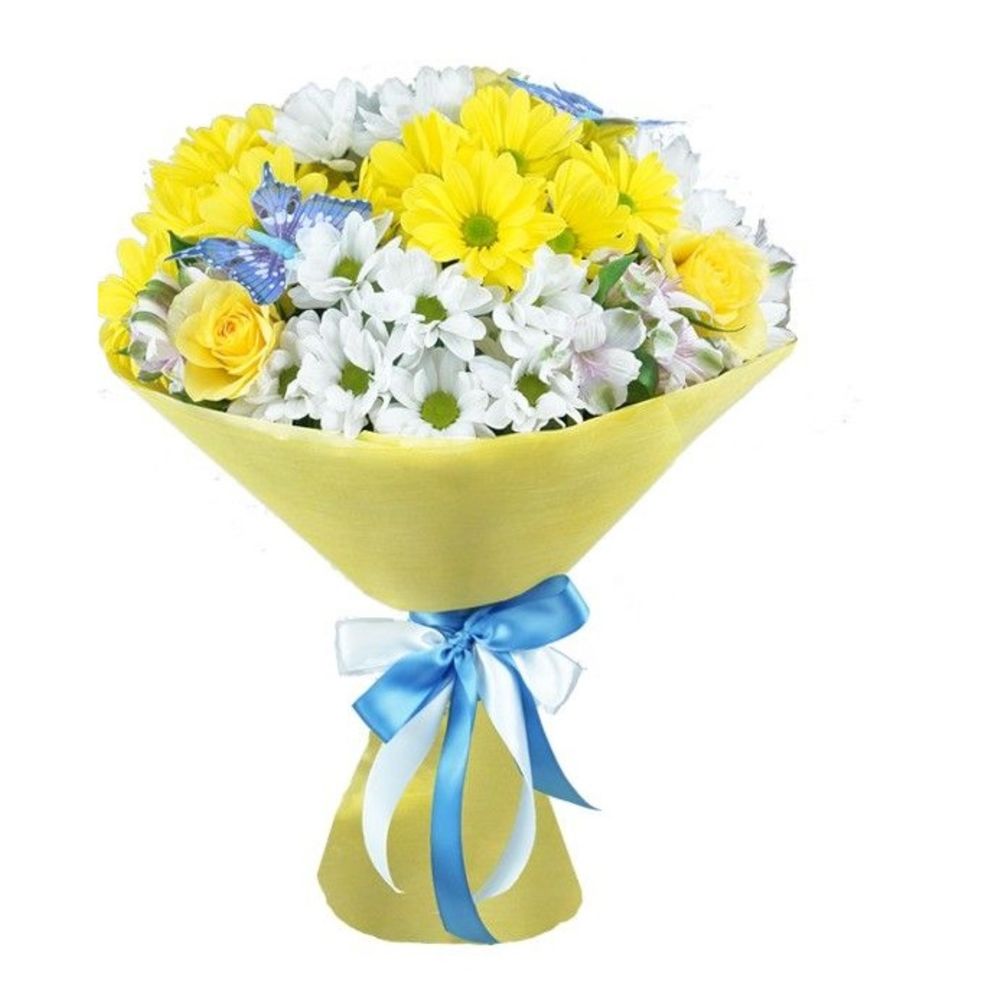 Роза желтая – 5 шт.Лента декоритивная – 1 шт.Бабочка – 2 шт.Альстромерия белая – 5 шт.Фетр – 1 шт.Хризантема кустовая белая – 4 шт.Листья салал – 1 шт.