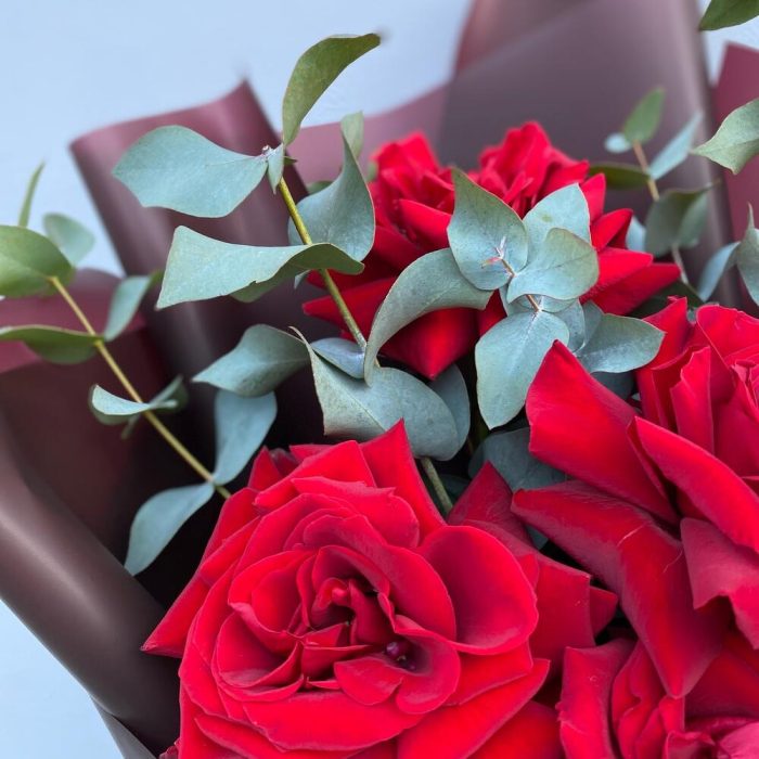 Эвкалипт – 1 шт.Лента атласная – 1 шт.Роза Freedom – 5 шт.Пленка матовая – 1 шт.