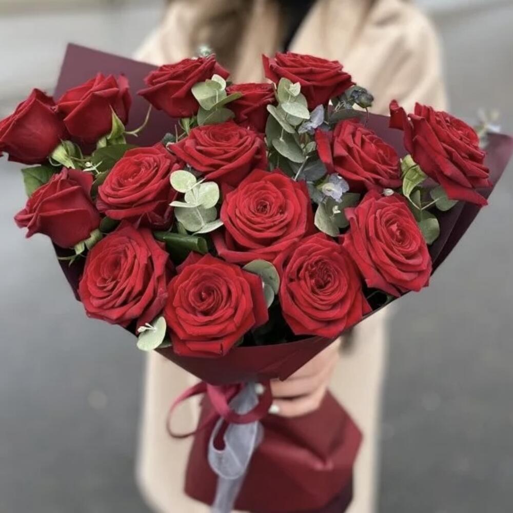 Роза красная – 15 шт.Эвкалипт – 7 шт.Стильная упаковка – 5 шт.работа флориста – 2 шт.