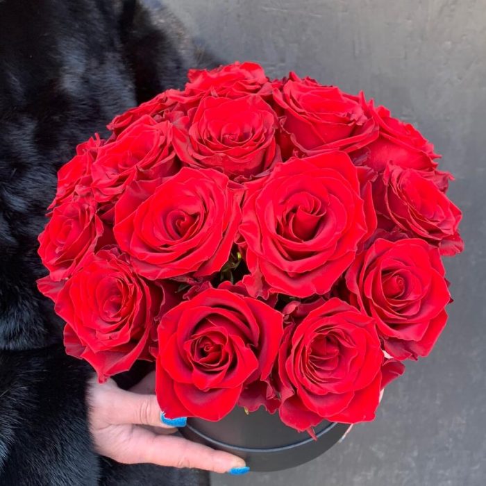 Роза красная – 19 шт.Оазис флористический – 1 шт.Шляпная коробка – 1 шт.