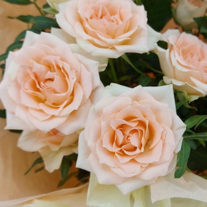 Нежные кремовые кустовые розочки в стильном оформлении. Такой букет всегда уместен и подойдёт для любого повода: День Рождения, именины, годовщина свадьбы, рождение ребенка, 8 марта, День Святого Валентина, выпускной и т.д. Можно вручить маме, сестре, подруге, коллеге, учителю, любимой.
