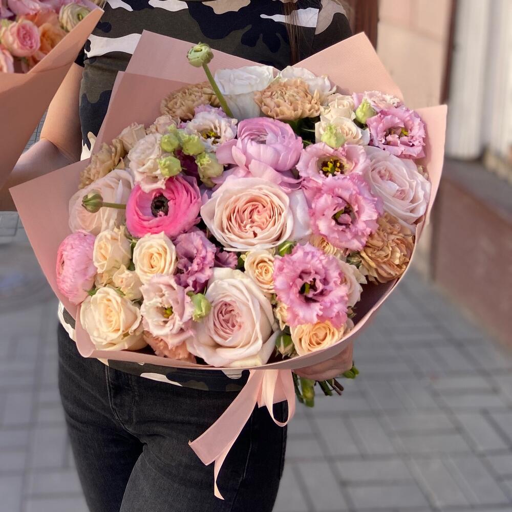 Роза одноголовая – 5 шт.Роза садовая кустовая – 4 шт.Лизиантус махровый – 4 шт.Гвоздика сортовая – 5 шт.ранункулюс или садовая роза по сезону – 3 шт.Эвкалипт пучок – 1 шт.Дизайнерская упаковка – 1 шт.Открытка – 1 шт.