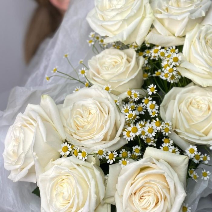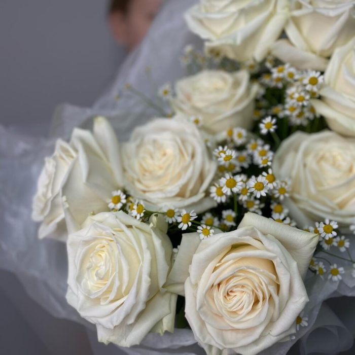 Роза Эквадор – 9 шт.Матрикария – 5 шт.Упаковка дизайнерская – 1 шт.подкормка для срезанных цветов – 1 шт.любовь флориста – 1 шт.записка с вашим текстом – 1 шт.шоколадный медиант ручной работы – 1 шт.советы по уходу за срезанными цветами – 1 шт.