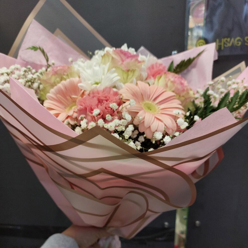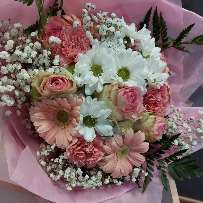 Роза эквадор 50 см – 5 шт.Гербера – 5 шт.Гвоздика – 5 шт.Гипсофила – 2 шт.Листья папоротника – 3 шт.Хризантема кустовая – 2 шт.Упаковка дизайнерская – 4 шт.Лента атласная – 2 шт.