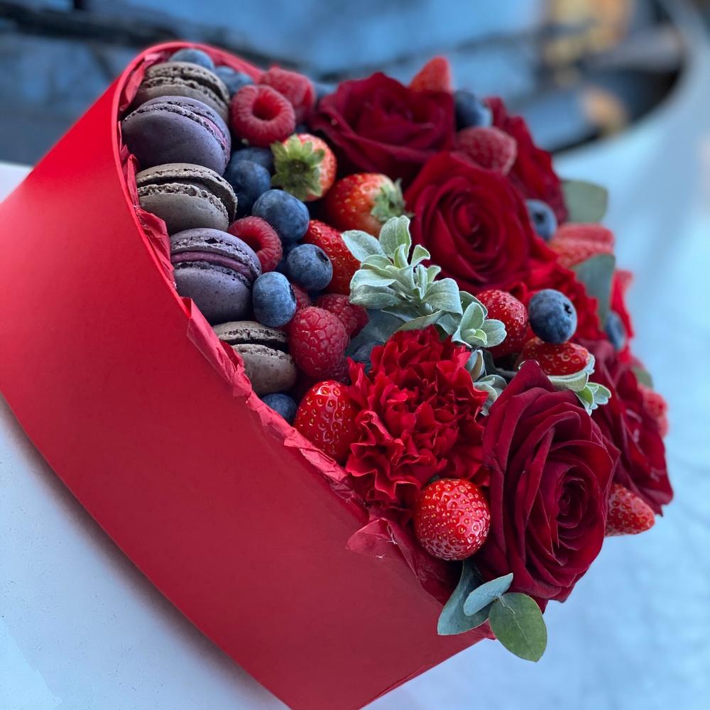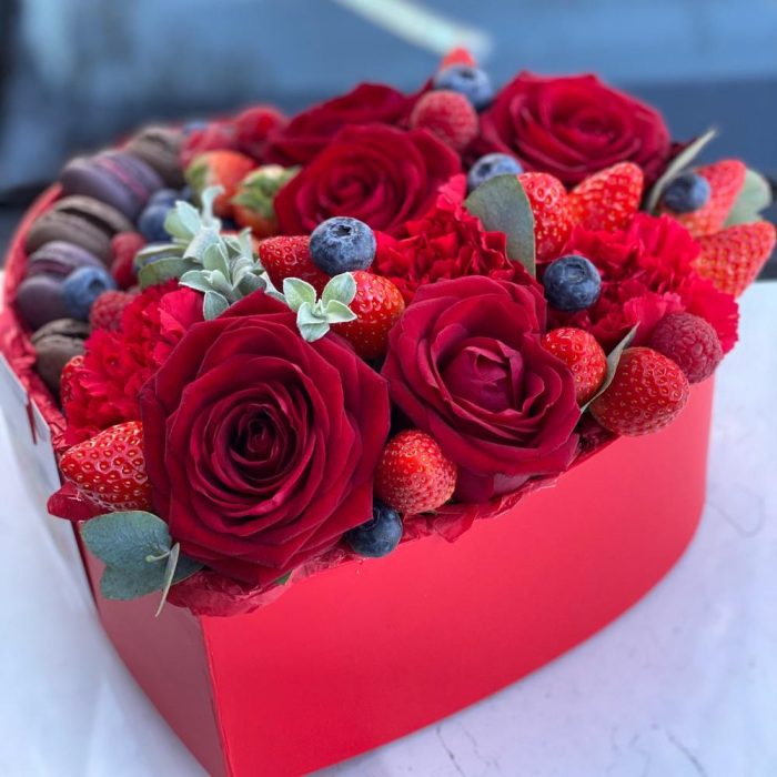 Сердце коробка – 1 шт.ягоды – 300 гр.Роза – 5 шт.Гвоздика – 3 шт.Зелень – 3 шт.