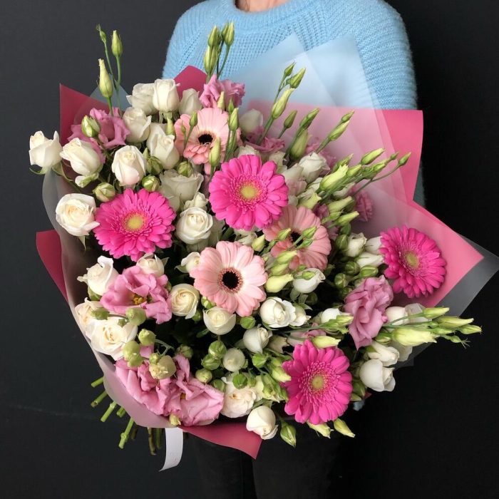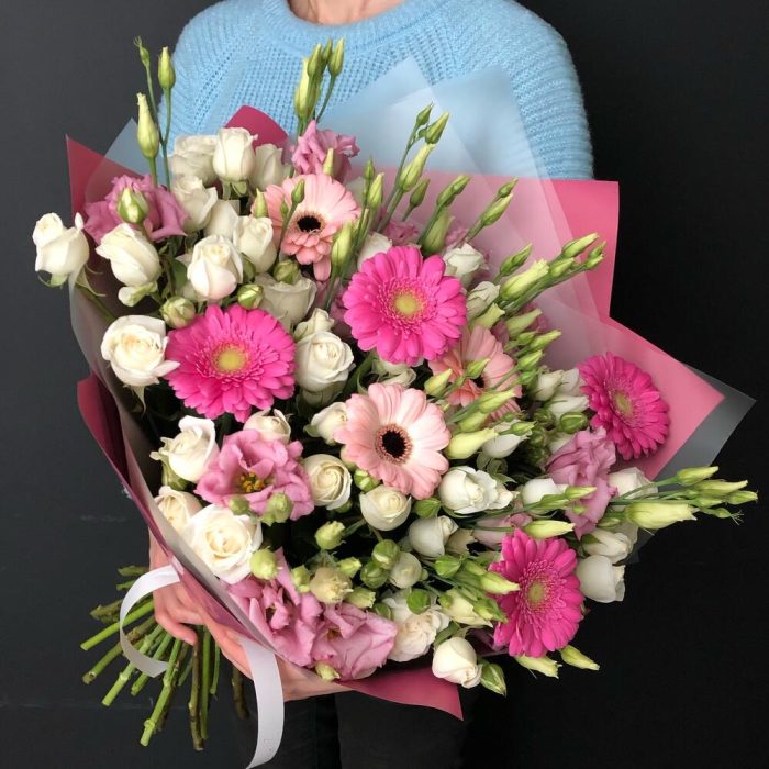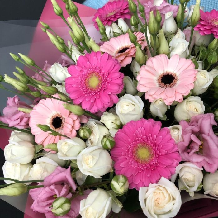 Роза – 9 шт.Лизиантус – 3 шт.Гербера мини – 7 шт.Упаковка дизайнерская – 3 шт.