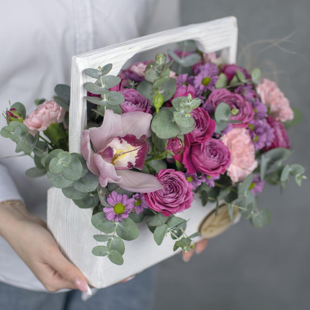 орхидея на удлинителе – 1 шт.Диантус – 5 шт.Сантини – 4 шт.Роза кустовая – 3 шт.пеннисетум – 1 шт.Альстромерия – 1 шт.Ящик – 1 шт.
