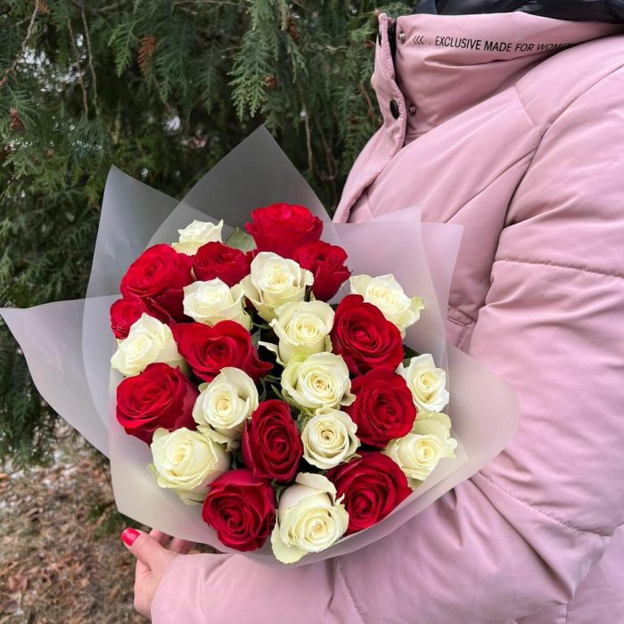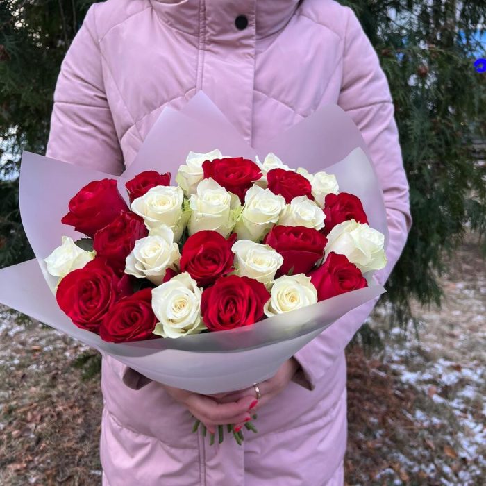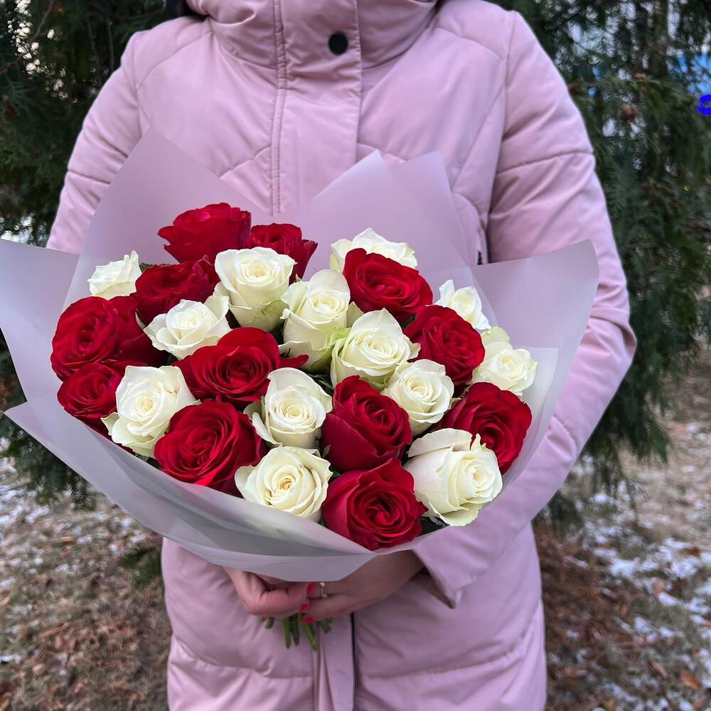 Роза красная – 13 шт.Роза белая – 12 шт.Пленка матовая – 1 шт.