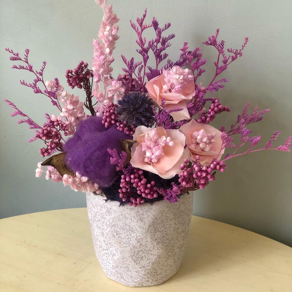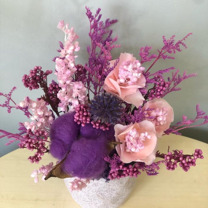 Керамическое кашпо – 1 шт.Хлопок – 1 шт.Роза стабилизированная – 3 шт.сорго – 1 шт.Лимониум – 1 шт.Озотамнус – 1 шт.Эхинопс – 1 шт.