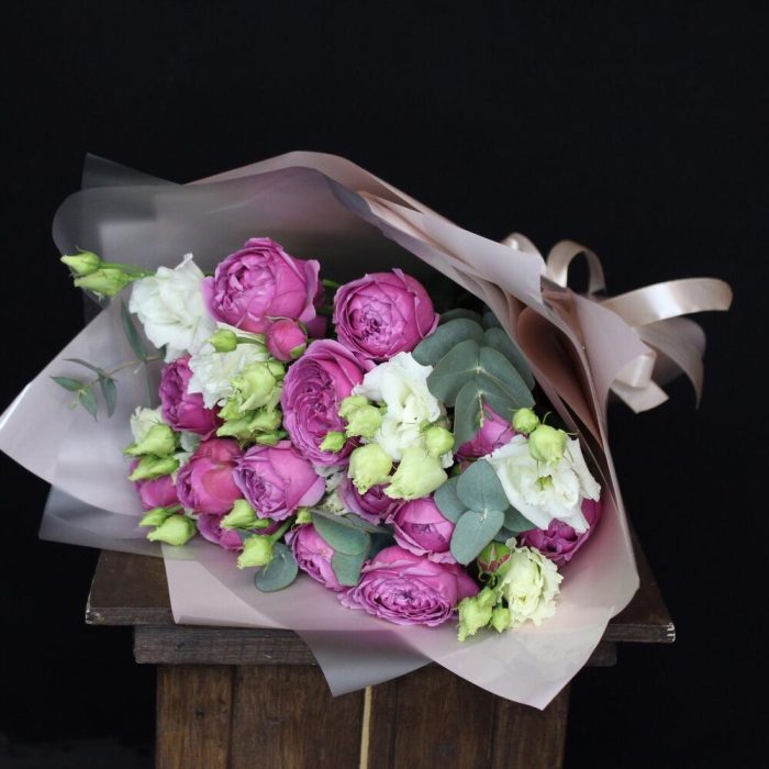 роза кустовая пионовидная misty bubbles – 4 шт.эустома махровая белая – 3 шт.Эвкалипт – 2 шт.Пленка матовая – 5 шт.Лента атласная – 2 шт.