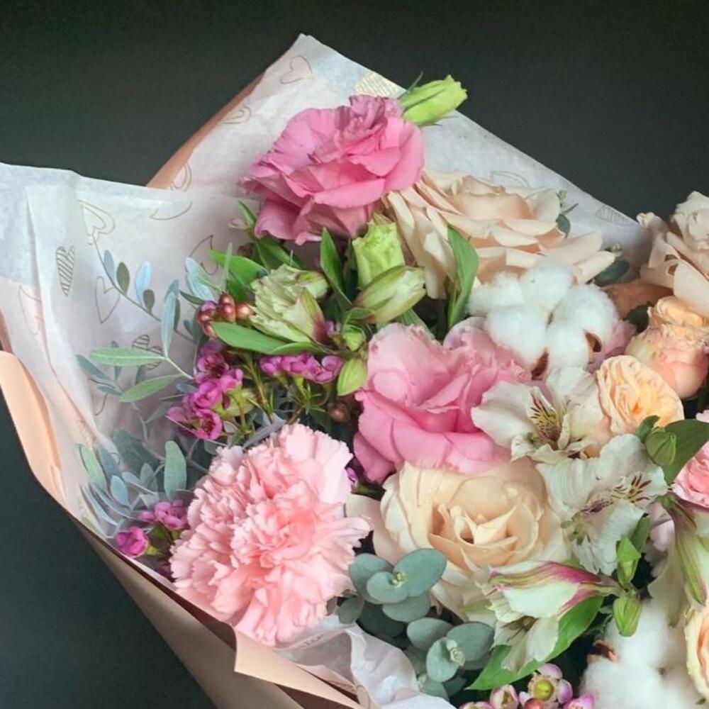 Кустовая роза – 2 шт.Диантус – 4 шт.Ваксфлауэр – 2 шт.Фисташка – 2 шт.Упаковка дизайнерская – 1 шт.Хлопок – 2 шт.Эустома – 2 шт.