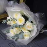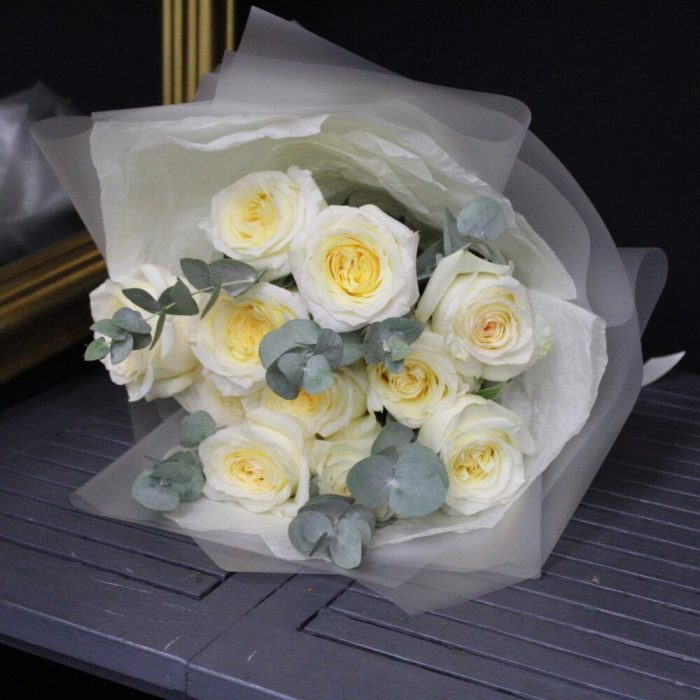 mono bouquet 143 из 11 пионовидных роз сорта candleligth с эвкалиптом