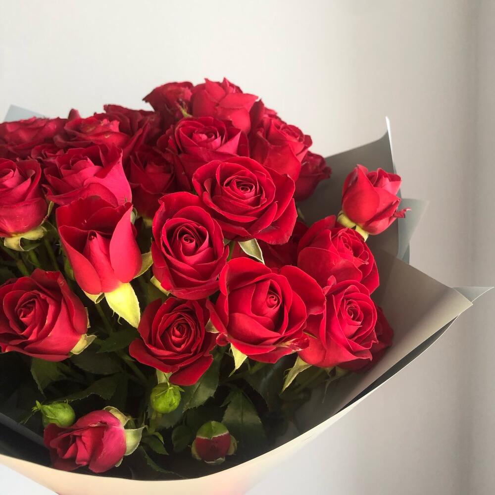 Кустовая роза – 9 шт.Лента атласная – 1 шт.Упаковка дизайнерская – 1 шт.