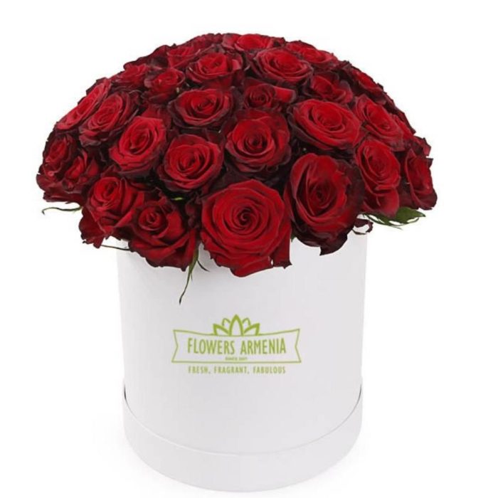 55 красные розы сорта “Эксплорер”, в белой коробке. Высота 35см.