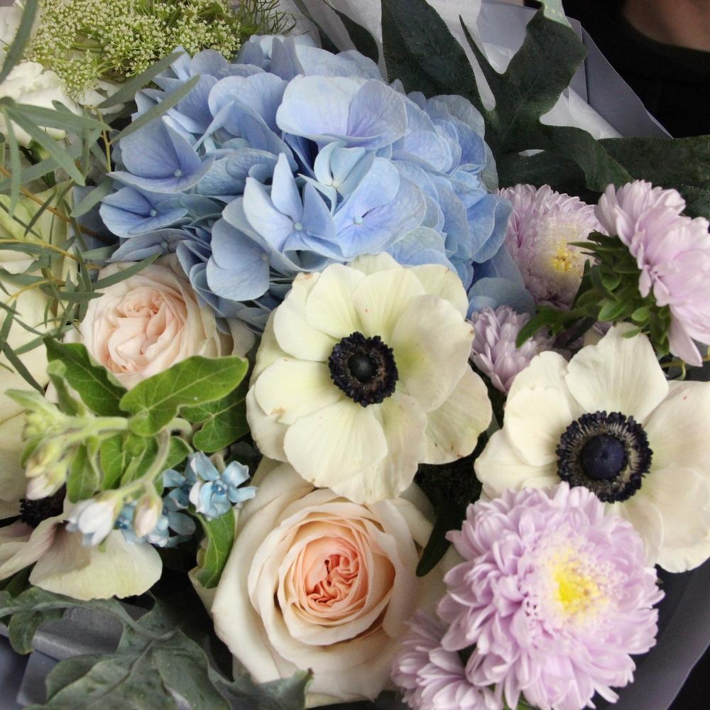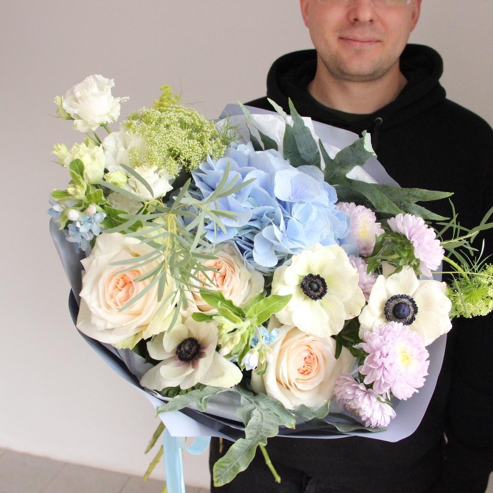Амми – 2 шт.Анемон – 3 шт.Астра – 3 шт.Гортензия – 1 шт.Лизиантус – 2 шт.Эвкалипт – 3 шт.Упаковка – 2 шт.Лента атласная – 1 шт.Роза пионовидная – 3 шт.Твидия – 2 шт.флебодиум – 2 шт.