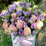 Чудесная композиция в коробке из нежных оттенков роз и лиловых эустом.