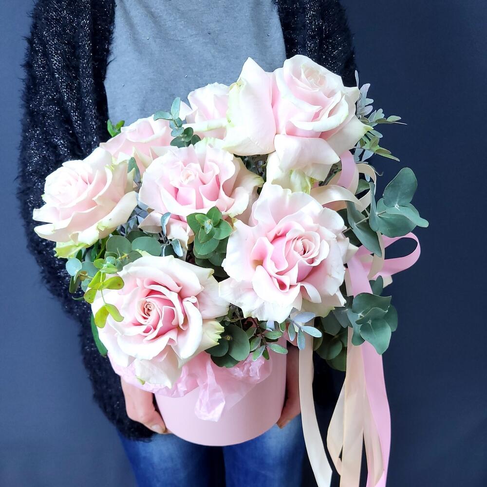 Эвкалипт – 3 шт.Роза Эквадор – 7 шт.Фисташка – 4 шт.Шляпная коробка – 1 шт.