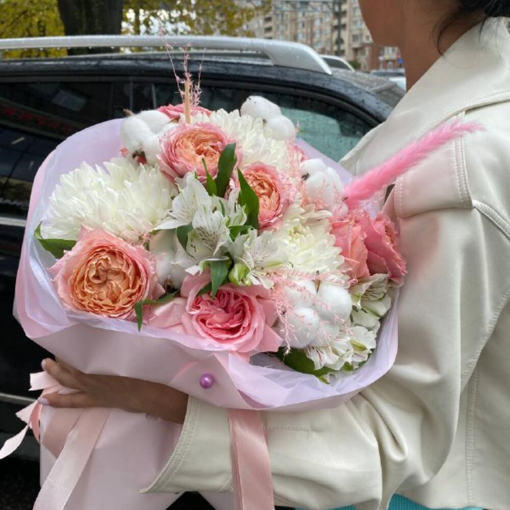 Хризантема – 3 шт.Роза Джульетта – 4 шт.Хлопок – 5 шт.Альстромерия – 2 шт.камыш – 1 шт.Упаковка – 4 шт.