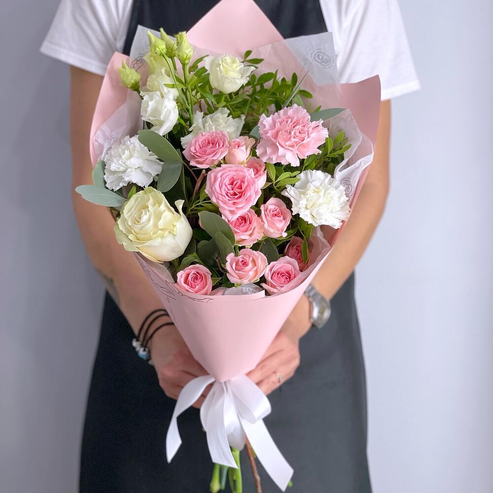 Кустовая роза – 1 шт.Роза Эквадор – 1 шт.Лизиантус – 1 шт.Гвоздика – 3 шт.зелень декоративная – 1 шт.Упаковка дизайнерская – 1 шт.