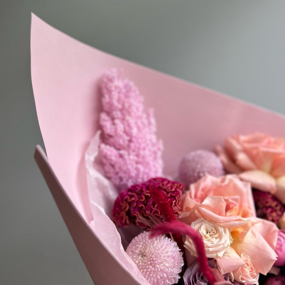 Гортензия – 1 шт.Французская роза – 3 шт.Целозия – 2 шт.момоко – 3 шт.Роза кустовая пионовидная – 2 шт.Роза кустовая – 3 шт.Роза Ол фо лав – 3 шт.сорго африканский – 2 шт.Сетария – 4 шт.Фисташка – 4 шт.