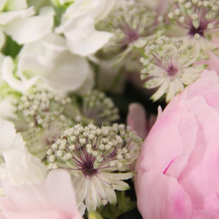 Пионовидная роза – 7 шт.Ранункулюс – 5 шт.Маттиола – 7 шт.Колокольчик – 3 шт.Лизиантус – 9 шт.Астранция – 4 шт.Эвкалипт – 11 шт.Шляпная коробка – 1 шт.Лента атласная – 3 шт.Тишью – 2 шт.Оазис – 2 шт.Пион – 5 шт.