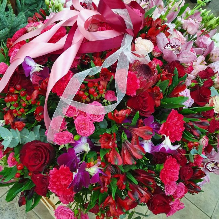 Корзина большая с ручкой – 1 шт.Оазис флористический – 8 шт.Фисташка пучок – 10 шт.Эвкалипт – 10 шт.Лизиантус – 20 шт.Маттиола – 10 шт.Роза кустовая – 30 шт.Альстромерия – 30 шт.Орхидея Цимбидиум – 5 шт.Протея – 3 шт.Гиперикум красный КУСТОВОЙ – 15 шт.Пион Сара Бернар – 20 шт.Орхидея ветка – 1 шт.Диантус – 13 шт.Роза Эквадор – 11 шт.