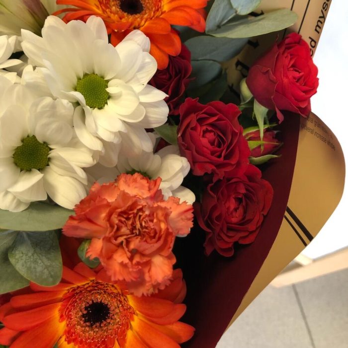 Хризантема кустовая – 1 шт.Гермини – 3 шт.Альстромерия – 2 шт.Роза кустовая – 2 шт.Гвоздика кустовая – 2 шт.Эвкалипт – 1 шт.Авторская упаковка – 1 шт.Лента атласная – 1 шт.