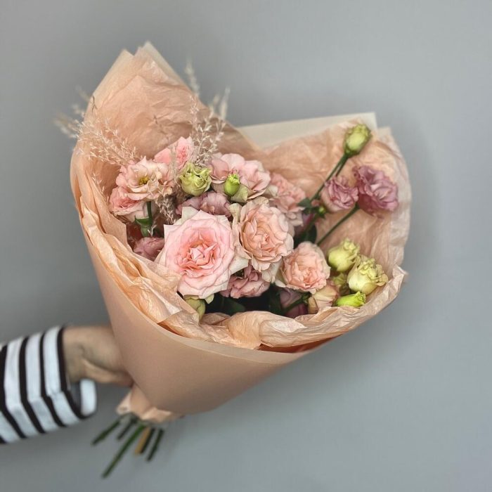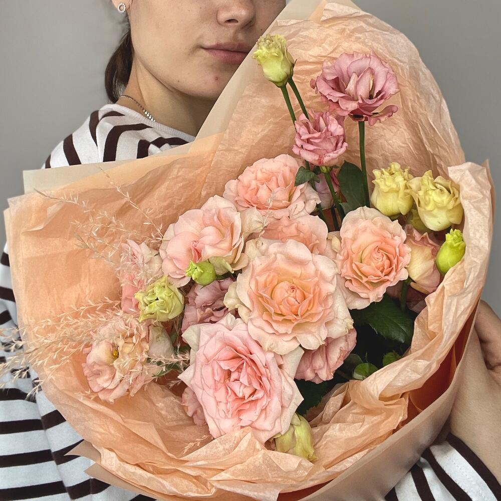 Персиковый букет с кустовой розой и эустомой с интересным раскрытиемМы используем для создания наших букетиков только качественный и свежий цветокСоздаем букеты с невероятной любовьюК букетику мы всегда прилагаем подкормку для цветочков – «chrysal”, чтобы они дольше сохраняли свою свежесть и красоту а также «Советы флористов» по уходу за срезанными цветочками Дополнительно к букетику Вы можете приобрести аквабоксы, транспортировочные коробки, крафтовые пакеты и вазы нужного размера
