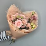 Кустовая роза – 2 шт.Эустома – 3 шт.Упаковка дизайнерская – 1 шт.подкормка для срезанных цветов – 1 шт.сухоцветы пучок – 1 шт.инструкция по уходу за цветами – 1 шт.записка с вашим текстом – 1 шт.медиант ручной работы из бельгийского шоколада – 1 шт.