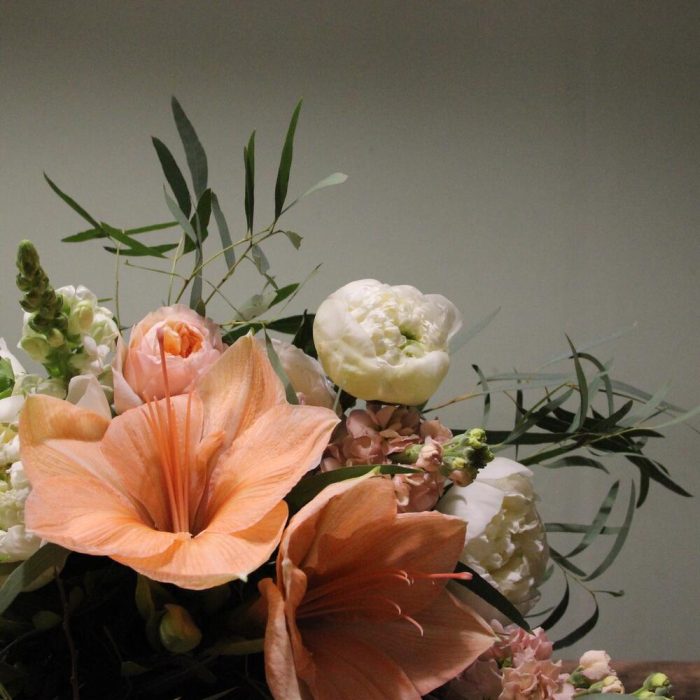 Персиковый – Букет с пионами, ранункулюсами и амариллисами