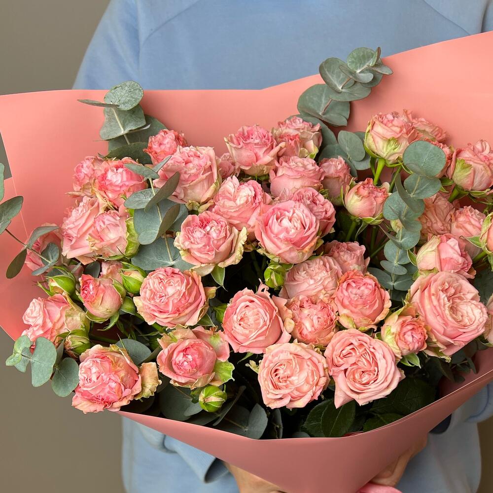 Огромный букет кустовых пионовидных роз с ароматным эвкалиптом.
