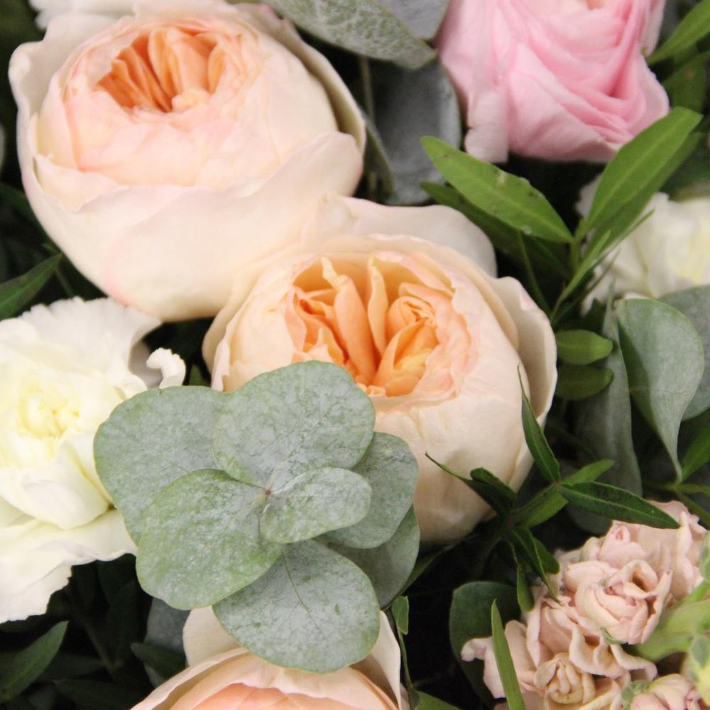 Нежный букет с английскими пионовидными розами, душистой маттиолой, эвкалиптом, озотамнусом и гвоздиками.