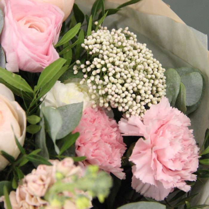 роза пионовидная juliet – 5 шт.Озотамнус – 2 шт.Маттиола – 4 шт.Гвоздика – 9 шт.Эвкалипт – 7 шт.Тишью – 2 шт.Бумага – 2 шт.Лента атласная – 2 шт.Ранункулюс – 3 шт.