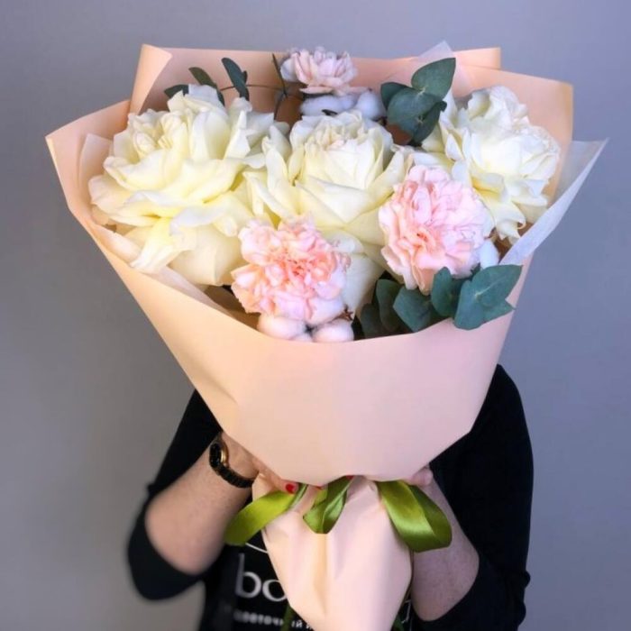 Пышный авторский букет из французской белой розы, розового диантуса и эвкалипта