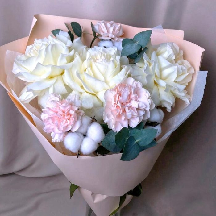 Хлопок – 3 шт.Эвкалипт – 3 шт.Гвоздика – 3 шт.Лента атласная – 1 шт.флористическая пленка – 1 шт.роза французская белая – 3 шт.подкормка для стойкости цветов – 1 шт.открытка для пожеланий – 1 шт.