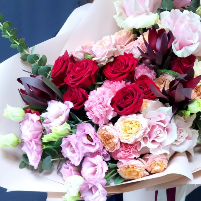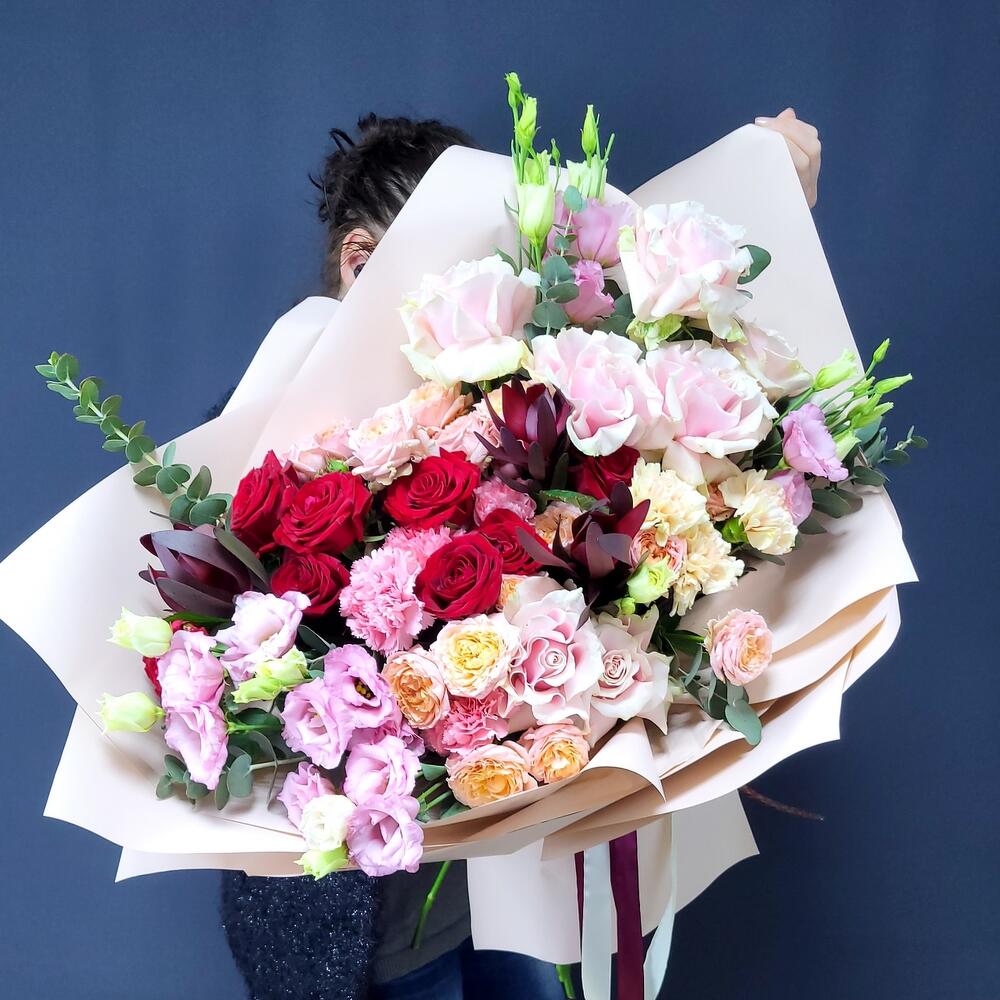Радужный букет с розами и лизиантусом Новолуние