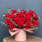 Эвкалипт – 5 шт. Роза Эквадор – 17 шт. Коробка шляпная – 1 шт. Оазис флористический – 1 шт.