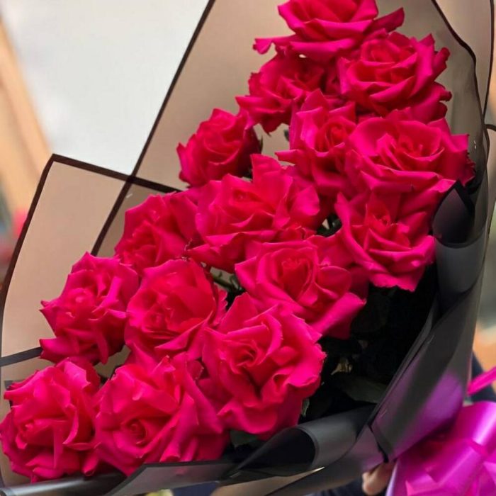 Роскошный букет из малиновых роз сорта Hot Explorer в стильном черном оформлении даже самых стильных и искушённых не оставят равнодушными