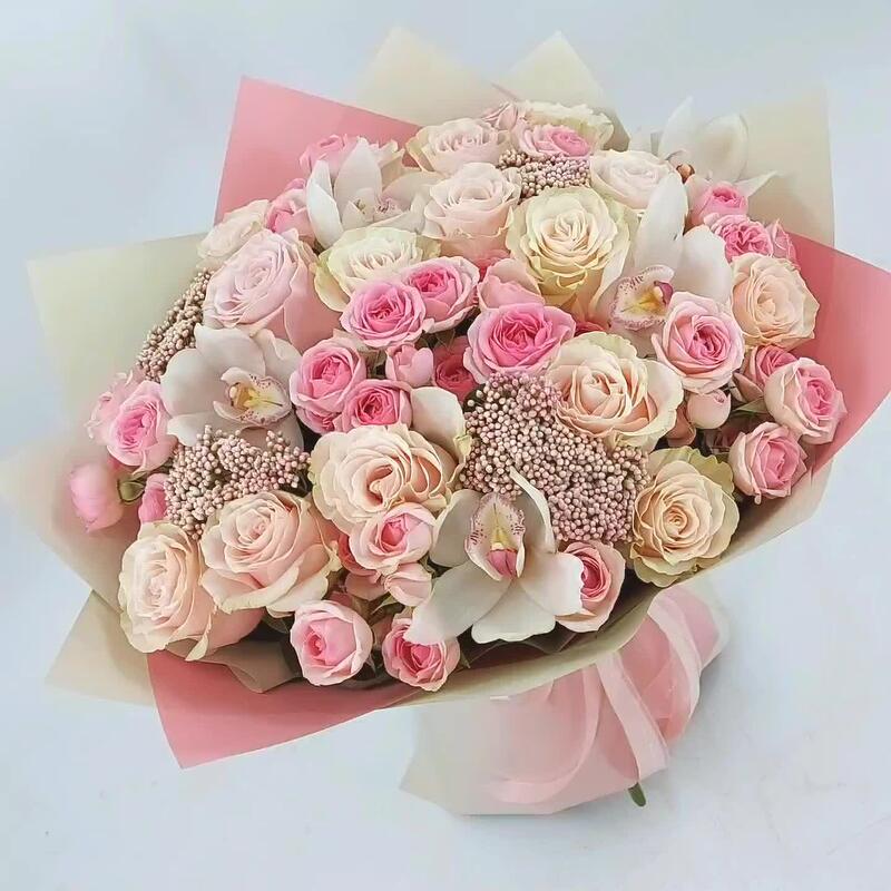Роскошный и невероятно нежный букет из роз и орхидей. Такой букет всегда уместен и подойдёт для любого повода: День Рождения, именины, годовщина свадьбы, рождение ребенка, 8 марта, День Святого Валентина, выпускной и т.д. Можно вручить маме, сестре, подруге, коллеге, учителю, любимой.